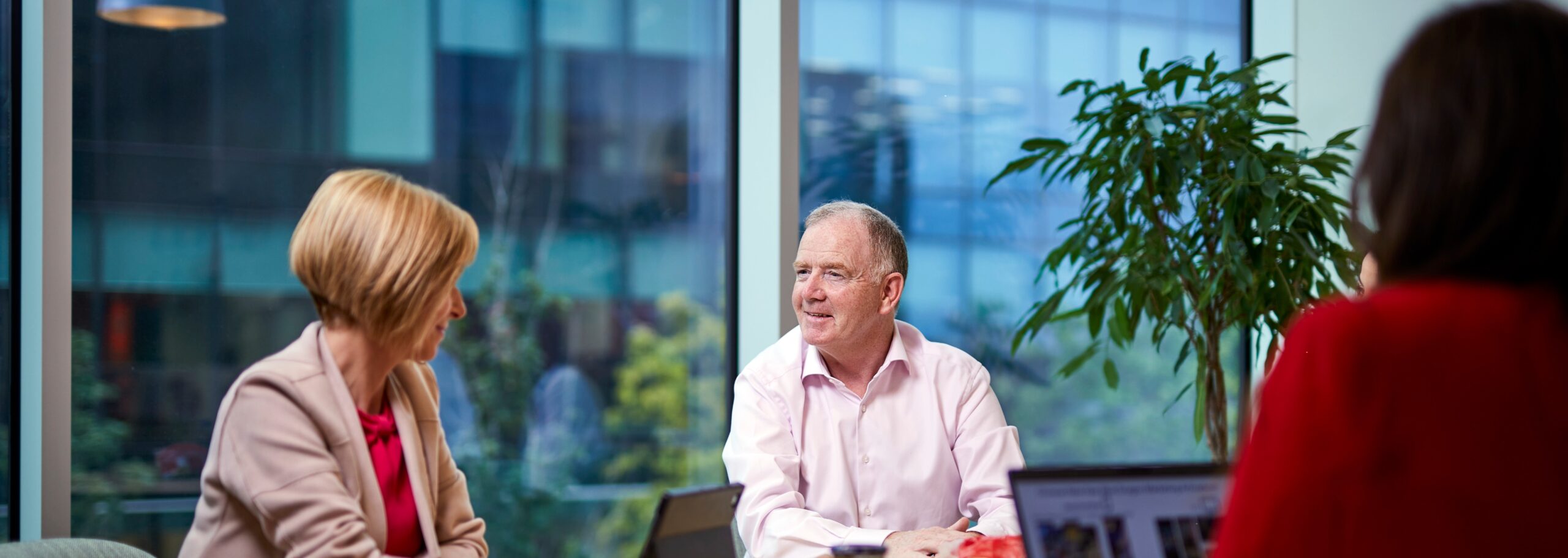 People chatting across a desk